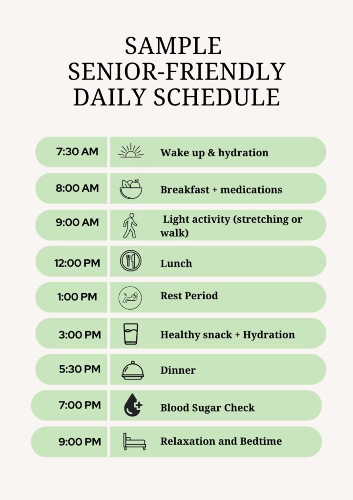 Consistency is one of the strongest tools in senior diabetes management. Predictable routines help regulate appetite, digestion, energy levels, and medication timing.
