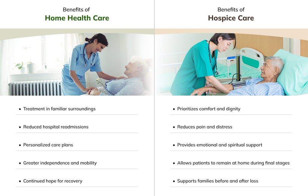 Hospice focuses on comfort when curative treatment has stopped, while home health care focuses on treatment and recovery.